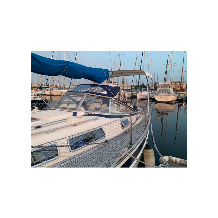 Floor mounting with stainless steel deck hinges. Made of Sunbrella Plus resin-coated acrylic fabric, equipped with zippers under the arches and passage/s for backstay/s,