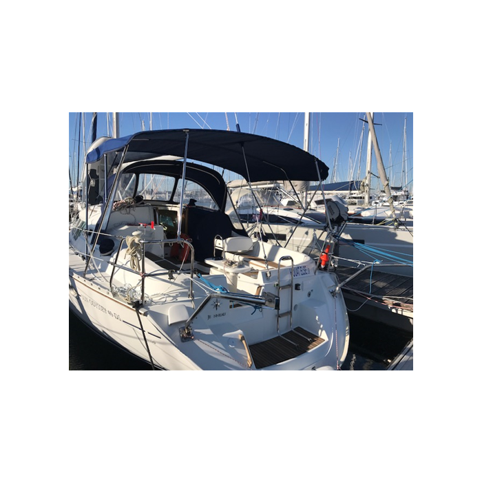 Floor mounting with stainless steel deck hinges. Made of Sunbrella Plus resin-coated acrylic fabric, equipped with zippers under the arches and passage/s for backstay/s, ensures effective protection from UV rays.